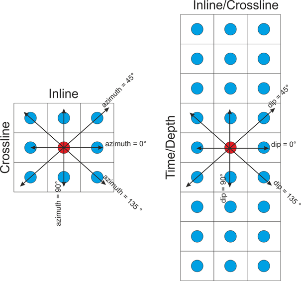 In this process azimuth of 0° is equal to inline direction; azimuth of 90° is equal to crossline direction. Dip of 0° is equal to horizontal direction, dip of 90° is equal to vertical direction.
