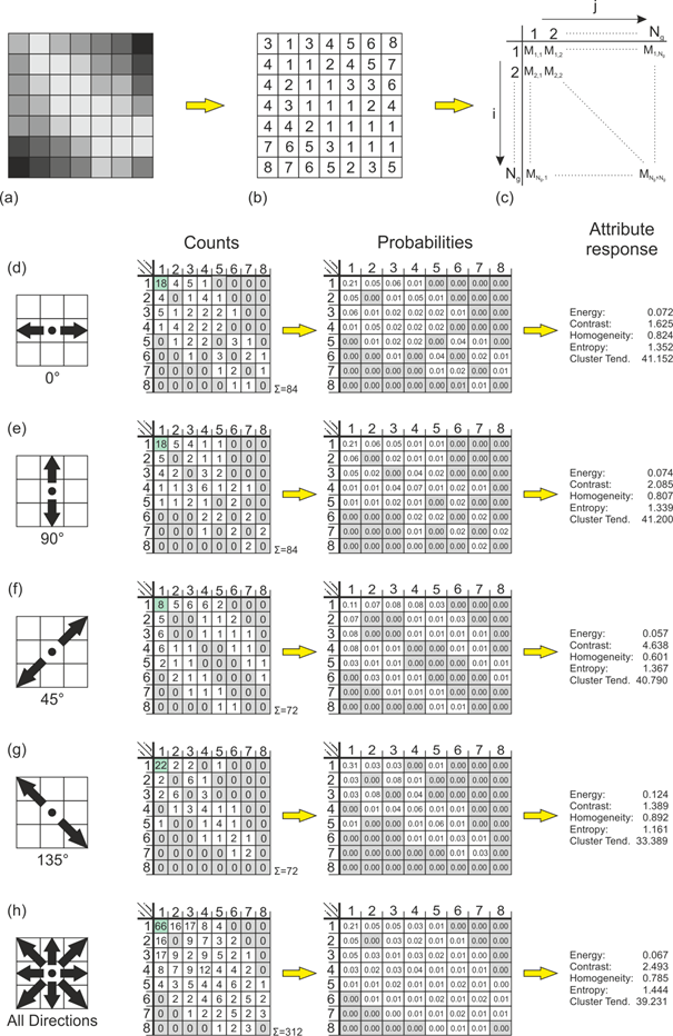Figure 1: Example for the calculation of grey level co-occurrence matrix-based attributes using eight grey levels for a randomly generated 2D grey-scale image (a). The grey-scales of the image can be represented by discrete values (b). The number of co-occurrences of pixel pairs for a given search window are counted and a grey level co-occurrence matrix (c) is produced. Based on this co-occurrence matrix, several attributes can be calculated. In this example, the grey level co-occurrence matrices are determined for the horizontal (d), the vertical (e), the 45° diagonal (f), the 135° diagonal (g), and for all directions at once (h). The first step in calculation is the determination of co-occurrences (column 2). Zero entries are marked in light grey and the highest value of each matrix is marked in dark grey. It is evident that calculations in single directions lead to sparse matrices. The GLCM is normalized by the sum of the elements to get a kind of probability matrix (column 3). Finally, the probabilities are used for the calculation of GLCM-based attributes. In column 4 the results for Entropy, Contrast, Homogeneity, Entropy, and Cluster Tendency are shown.