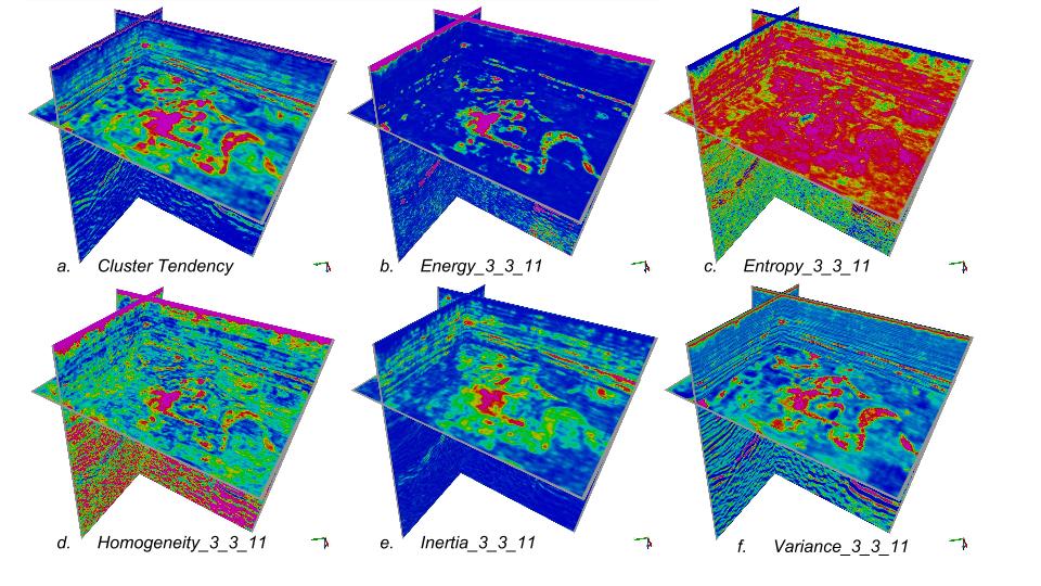 Texture- Directional uses the grey level co-occurrence matrix (GLCM) and its derived attributes are tools for image classification that were initially described by Haralick et al. (1973). Principally, the GLCM is a measure of how often different combinations of pixel brightness values occur in an image. It is a method widely used in image classification of satellite images (e.g. Franklin et al., 2001; Tsai et al., 2007), sea-ice images (e.g. Soh and Tsatsoulis, 1999; Maillard et al., 2005), magnetic resonance and computed tomography images (e.g. Kovalev et al., 2001; Zizzari et al., 2011), and many others. Most of these GLCM applications are for classification of 2D images solely. The application of GLCM for seismic data has been a minor topic in comparison to common seismic attributes such as coherence, curvature or spectral decomposition. Today, a high percentage of the available seismic data is 3D seismic. Therefore, it is important for the classification of seismic data to adapt the GLCM calculation to work in the three-dimensional space. Few authors have described the application of GLCM for 3D seismic data with various approaches to this topic (Vinther et al., 1996; Gao, 1999, 2003, 2007, 2008a, 2008b, 2009, 2011; West et al., 2002; Chopra and Alexeev, 2005, 2006a, 2006b; Yenugu et al., 2010; de Matos et al., 2011; Eichkitz et al. 2012, 2013, 2014).