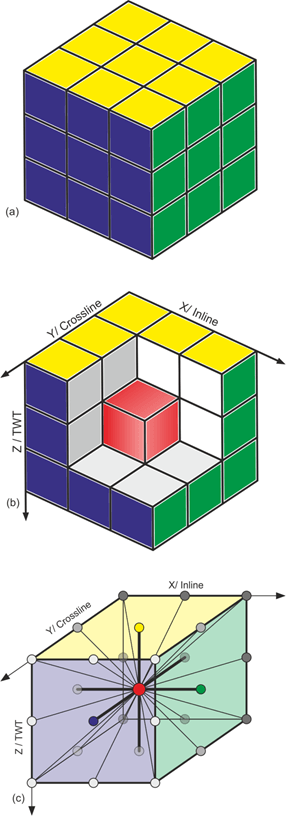 Figure 2: The number of principal neighbors for one sample point can be best explained by looking at a Rubik’s cube (a). The center of the Rubik’s cube (core mechanism for rotating the cube, red box in (b)) has in total 26 neighboring boxes (including diagonal neighbors). These boxes are aligned in 13 possible directions. Analogous to this, a sample point within a seismic sub-volume has 26 neighbors aligned in 13 directions (c). In the developed workflow it is possible to calculate the GLCM along single directions, along combinations of directions (e.g. inline direction, crossline direction, …), or all directions can be calculated at once (after Eichkitz et al., 2013).