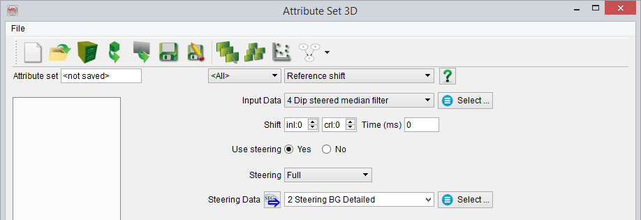 Description: The Input attribute is extracted at the shifted position. Original reference (extraction) point has inline crossline coordinates (0,0). Relative number 1 means the next inline or crossline, respectively. The vertical shift is specified in ms using the Time option, or can be derived using Steering.