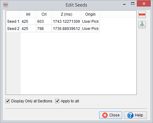Edit Seeds window will show the origin (user defined or wells) of the picks. By default the seeds are displayed on sections (e.g. inlines/crosslines only). To view in 3D, you may want to toggle this feature off.