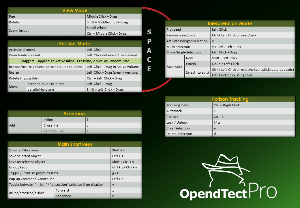 Positioning, zooming, panning, rotating and interpreting data in the 3D scene are core interactions in OpendTect which are done with mouse clicks and drags. Some operations require holding a Shift or Control key while clicking. OpendTect supports a range of short-keys to speed up various interactions. The default settings of the most important short-keys and mouse-controls are given in the tables below: