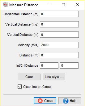Tool to measure distances by drawing a polyline on an inline / crossline or on a Z-slice. The tool returns horizontal distance (meters or feet), vertical distance (ms in time survey or meter / feet in depth survey) and the inline or crossline distance respectively. For time surveys the vertical distance is computed with a user-specified constant velocity.