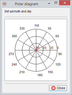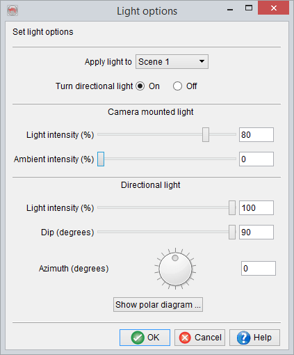 Show polar diagram: The azimuth and dip can be visualized using this diagram. This diagram can be used in combination with the sliders of the main dialog in order to position the directional light around the scene.