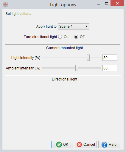 Camera mounted light: Use this slider to change the percentage of intensity of the camera light or the head light. 0% corresponds to total darkness while 100% corresponds to full intensity. Similar to the directional light dialog, the changes made to the azimuth and dip are instantly reflected in the selected scene(s).