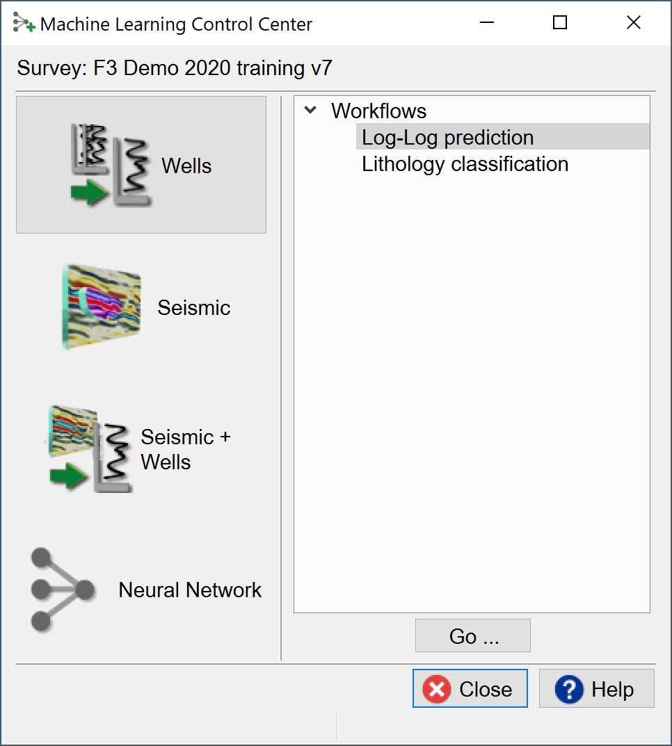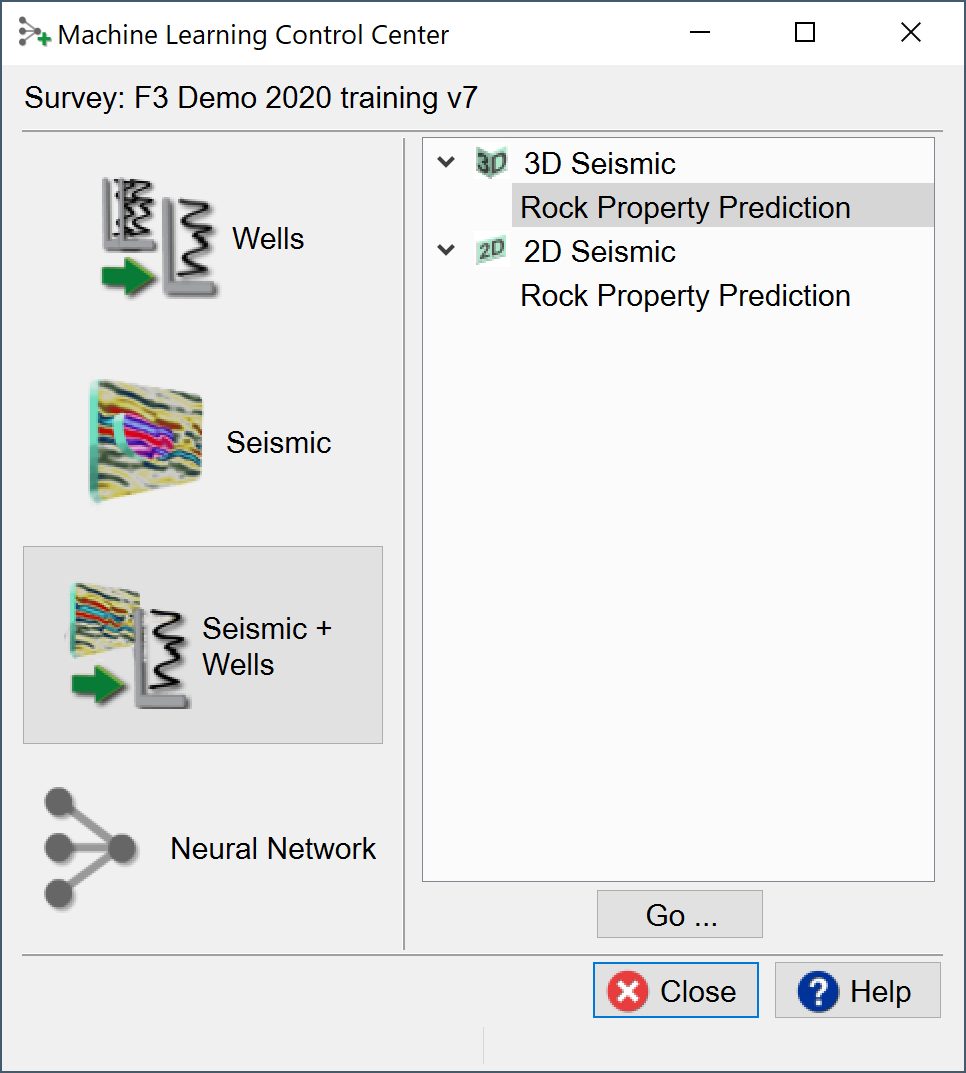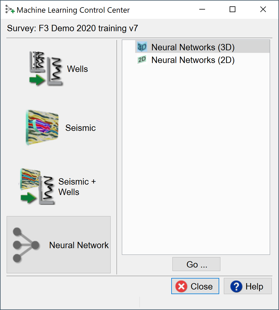 First we select the type of data we are working with: Wells, Seismic, Seismic + Wells, or Neural Networks. The latter refers to the pre-existing Neural Networks plugin that is now started from inside the ML control center.