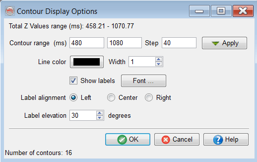 Add Contour Display: This option displays the contour on the horizon. That the contour step (interval) is automatically calculated but can be edited at any time. The input for the contour display can be either a reference Z or any surface attribute like Similarity, Energy, Dip etc ...