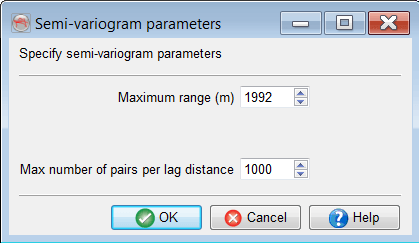 To compute the variogram, parameters need to be provided: the maximum range (maximum distance allowed between the pairs for the analysis), the step and the minimum pairs per log distance: