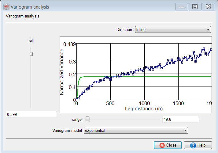 The variogram describes the spatial continuity, here in the horizontal direction but it can also be computed vertically from the crossplot tool. It is commonly represented as a graph that shows the variance in measure with distance between all pairs of sampled locations. Modeling of relationship among sample locations to indicate the variability of the measure with distance of separation is called Semivariogram or Variogram modeling. Variograms are important when doing inversion as it allows to predict a value at a location where it has not been measured.