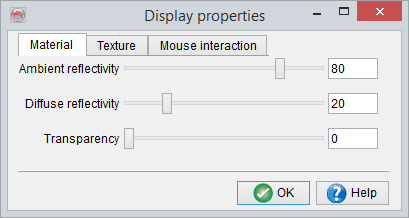 Properties: Access display parameters; Transparency, Ambience/diffuse relflection, texture and mouse movement (scroll and pan settings).