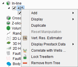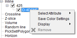 Each individual element (Inline/Crossline/Z-slice) has a similar pop-up list menu (see below). There are two different ways to open this list. Either display it from the Tree (as shown below) or display it in the scene. In the latter case, place the mouse over the inline/crossline/Z-slice and right-click to launch the tree. This menu list has several functions that are described in following text.