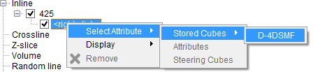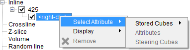 Any desired cube can be selected from the list. The selected cube will be added as an attribute for the displayed inlinecrossline/Z-slice number. The added attribute can also be replaced at any time by right-clicking on it (see the figure below).