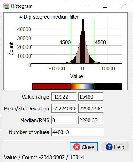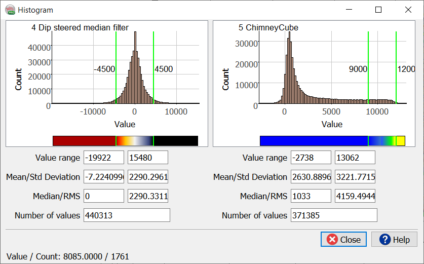 Histograms: The histograms of all added attributes of an element can be displayed using the right-click option of the parent element (inline number, surface name...). It is a useful tool to clip the ranges of an attribute by using vertical green lines in the histogram: The vertical green lines show the current amplitude range and can be moved left or right using the left mouse-click. The display is updated when the mouse click is released. This is performed independently for each attribute. Please note that this will toggle off the automatic clipping.