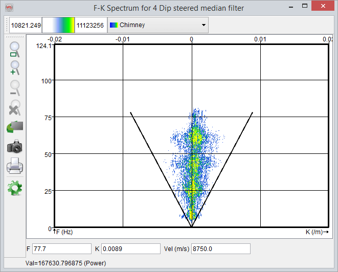 Show F-K Spectrum: A two-dimensional Fourier transform over time and space where F is the frequency (Fourier transform over time) and K refers to wave-number (Fourier transform over space).