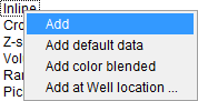 Inline, Crossline and Z-slice elements can be added into the tree by clicking on the element name and selecting Add/Add default data/Add color blended from the pop-up menu. The Add option will insert an inline/crossline/Z-slice with a blank line in the middle of the survey (ready for an attribute or stored cube to be loaded). If a well has been loaded in the project and is within the survey box, it is possible to Add at Well location an inline or crossline. The inline/crossline loaded will be according to the surface coordinates that can be found in the well manager information summary section. Once added, a selection window will pop up to select the attribute to display: Stored volume, Attribute from the active attribute set,... If cancel is clicked, the attribute line will stay blank in the scene and the tree entry will read <right click>.