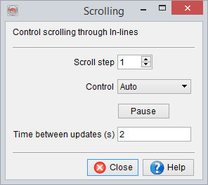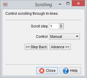 By pressing the Scroll button, elements are moved either manually (select Control Manual), or automatically (select Control Auto). Scroll in the inline/crossline direction by specifying a fixed Scroll step. In the manual mode, the line/Z-slice is stepped to the new position after each subsequent click on the Advance button. In the automatic mode, the line/Z-slice is updated in a movie-style with a fixed time interval (in seconds) - Time between updates. The auto-scrolling can be paused by pressing the Pause button. To resume the auto-scrolling again press Go button.