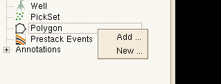 A Polygon is a close line defined as connected points. It defines an area that can be used to define an area of subselection for example. The drop down menu gives the option to either Add… an existing polygon or to create a New… by manually picking on a loaded surface (either horizon or Z-slice) in the 3D scene.
