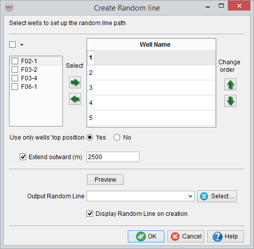 Press the preview button to see a top view of the random line that will be created. If the preview does not show exactly the desired random line, then change the parameters (the wells involved or the order in which they are listed). You can save the newly created random line by specifying the name in Output Random line(s) field. If you want to display the random line on creation, check the box Display Random Line on creation.