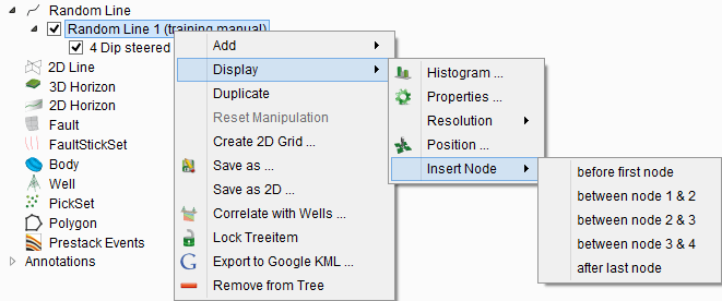 Manual Mode. In manual mode, the random line will first be displayed in the 3D scene. Nodes may be added and their position changed interactively, in a second step. This starting random line will have two nodes, one at each end of the central inline. More nodes can also be inserted in the right click menu of the random line in the tree (see figure below). Please note that the same menu is available with the right-click on the random line in the scene.