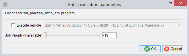 'Execute remote' toggled on to send the job to a remote machine. The job priority can be changed (-19-lowest to +19 highest).