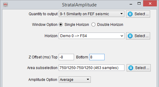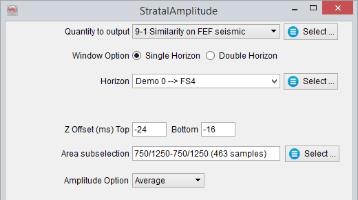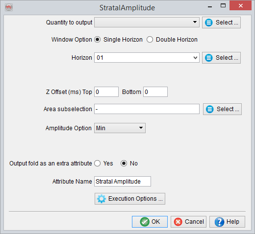 Stratal Amplitude is a processing tool available to compute statistics (min, max, rms, etc.) from an attribute along a horizon or between two horizons. The window can be launched from Processing > Create Horizon output > Stratal Amplitude. The output will be stored as horizon data (grid) saved on the top or base horizon.