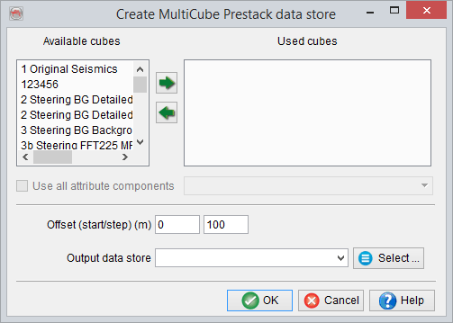 Create the volume output: Go to Processing > Create Seismic Output > Attribute > Multi-cube data store and select a volume that contains multiple components (here, Spectral Decomposition as example):