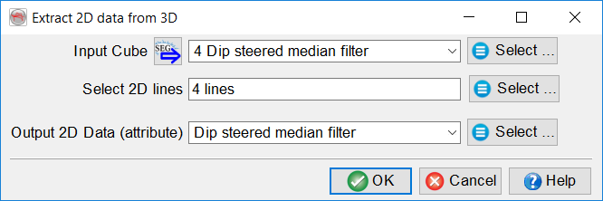 Extract 3D data onto selected 2D lines. Input data is required in the form of a stored 3D volume. One or more 2D lines can be selected for the 3D data to be extracted onto. The output data set requires naming: