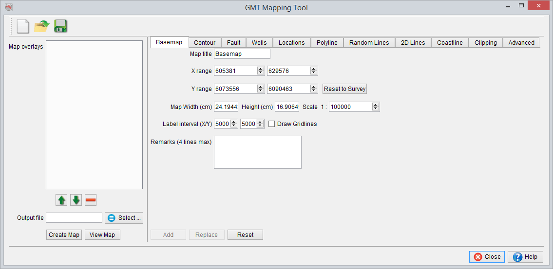 The basemap tab is filled with default parameters including the X/Y range from the Survey setup. You can go back at any point to the default X/Y range in clicking on Reset to Survey.
