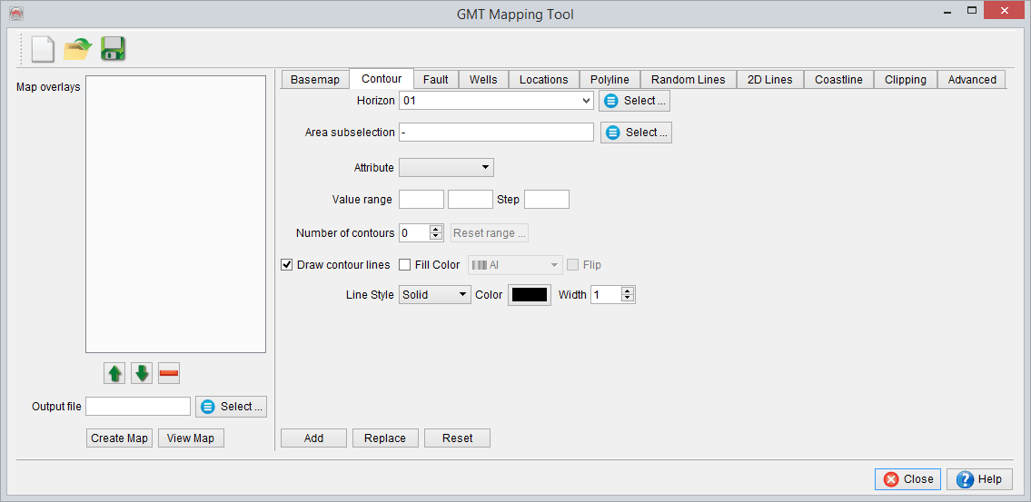 In Contour Map tab, first of all, select the horizon on which you want to create contours. The different parameters are then filled by default. It is possible to edit the value range and/or the number of contours. This will change the step. If you modify the step, it will automatically change the number of contours.
