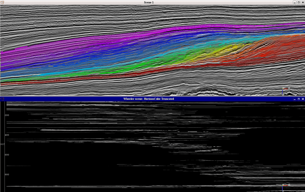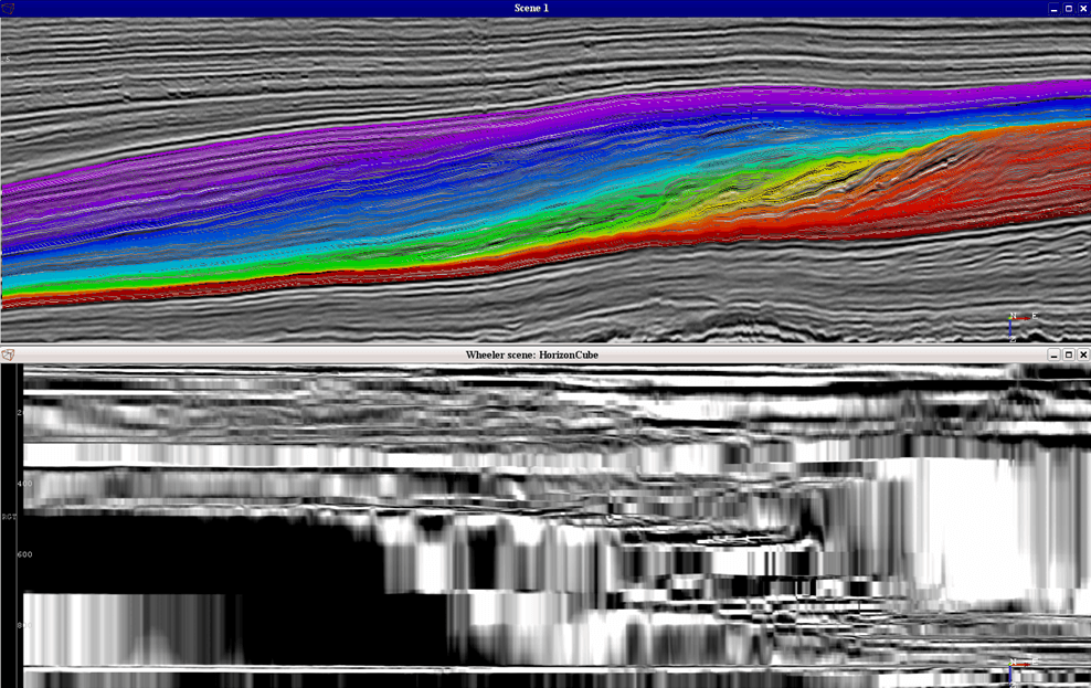 Top scene is a display of a seismic data and the HorizonCube with continuous events. Bottom display is the Wheeler Transformed Scene of the HorizonCube. The same seismic data is displayed in the wheeler domain.