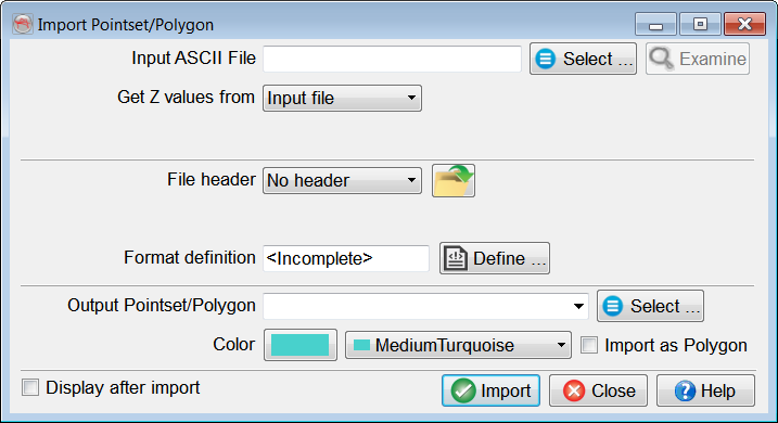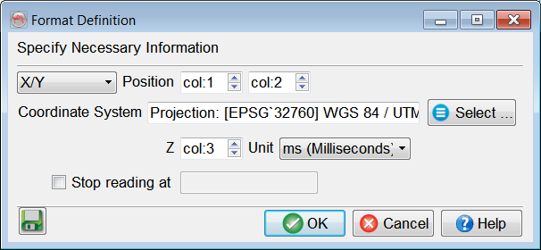 You must specify in the format definition window the column numbers for the position, in terms of an X/Y pair or an inline-crossline pair, and the point column. points that should not be read must all have the same numerical value, which is to be filled in as the "Undefined value". The Z units can be seconds, milliseconds or microseconds. Reading may be stopped at a specific line by providing the adequate keyword.