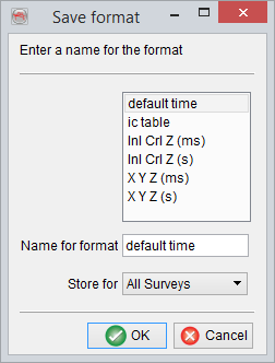 icon . In pop-up window, write the name of the format and store it. The format can be stored at different levels (All surveys, Current survey, Current OpendTect user level) depending on the usage.