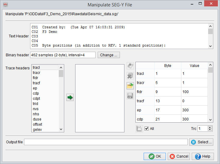 This powerful utility (available via SEG-Y wizard or classic SEG-Y import tool) allows to edit text, binary and trace headers of a SEG-Y file. All changes made to SEG-Y headers can only be saved to a new Output file.