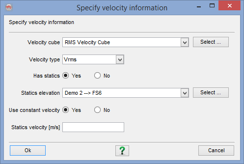 - Vrms: RMS velocities (time domain only). A provided surface may provide elevation statics in meters. For time surveys a statics velocity must be provided in m/s, either from a velocity grid or using a constant velocity.