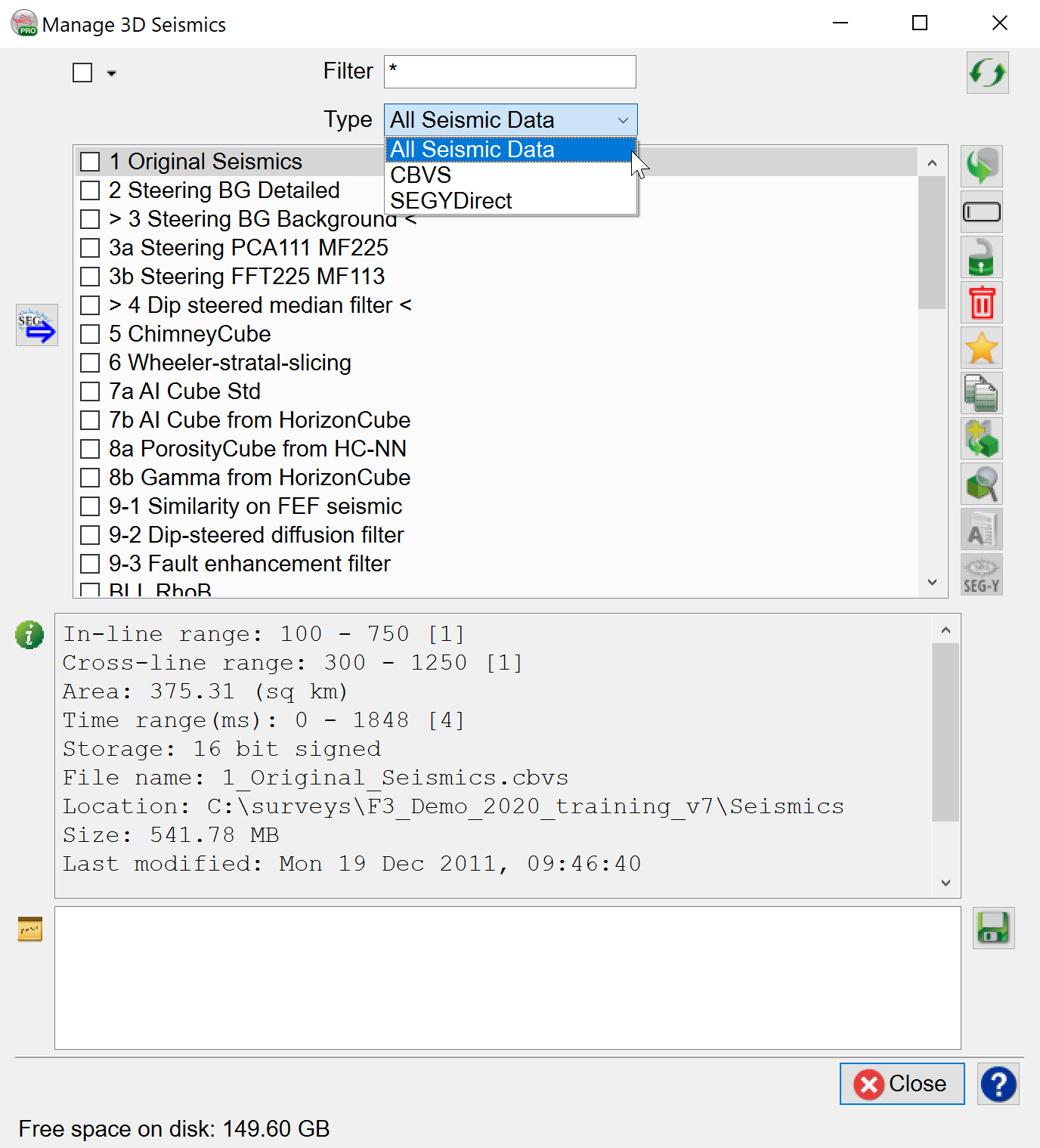 The 3D Seismic file management window lists poststack volumes loaded in the survey. Information related to the selected volume is displayed in the central field and personal/survey-related notes can be added and saved in the bottom field.