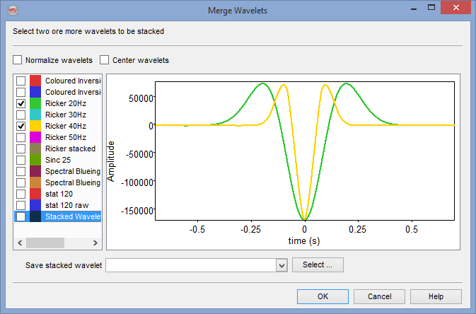 Two or more wavelets can be stacked using this option. The wavelets can be 'Normalized' and/or 'Center' at maximum amplitude/energy.