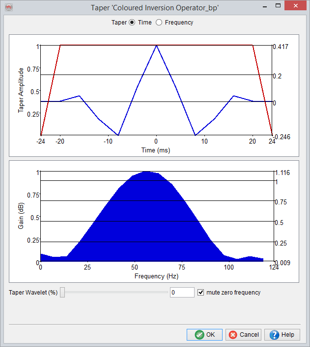 In time domain, the selected wavelet is tapered by selecting a tapering percentage (%), which is set from the slider available at the bottom of the window. This is done by moving the slider left or right. Additionally, the amplitudes at zero frequency can also be muted by setting check to mute zero frequency check box.