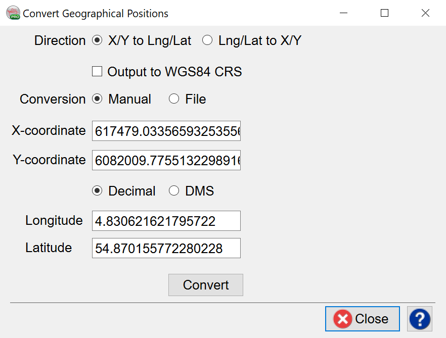 In the Convert Geographical Positions window, there are two modes available for coordinate conversion: Manual/File.