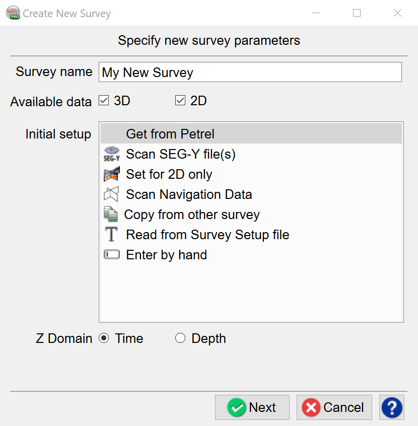 To launch the survey setup window select New in survey selection window. The following window will appear on your screen: