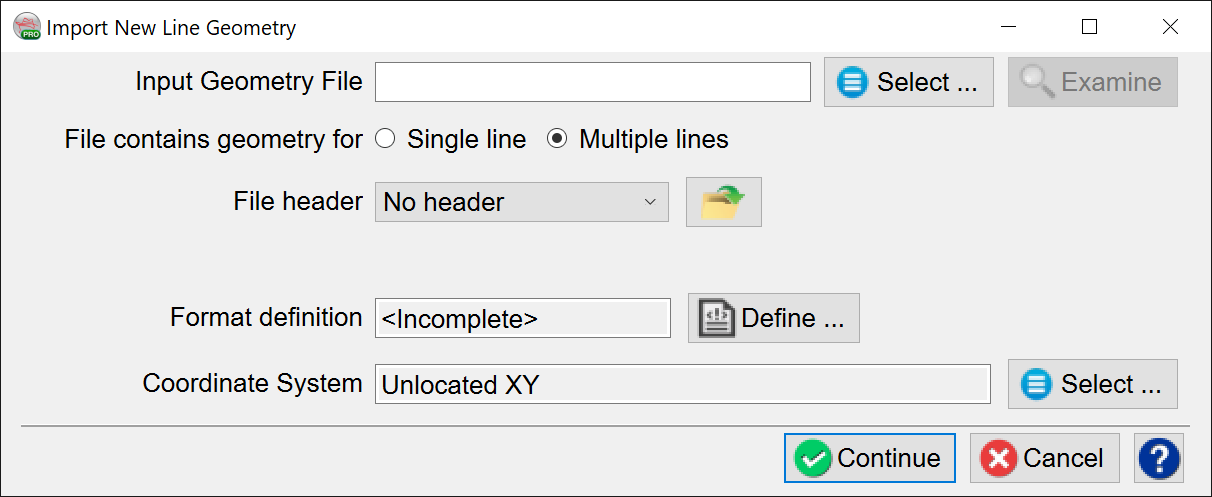 Scan Navigation Data:allows for the import of a (2D) Geometry file. Choice of single or multiple lines, and selection of the Coordinate Reference System: