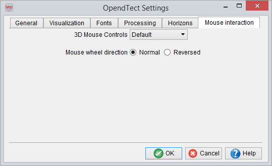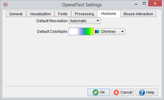 Using this option, one may set both the default resolution and default colortable for horizons. This is an especially helpful option for orientation in the early stages of a project when many horizons are loaded.