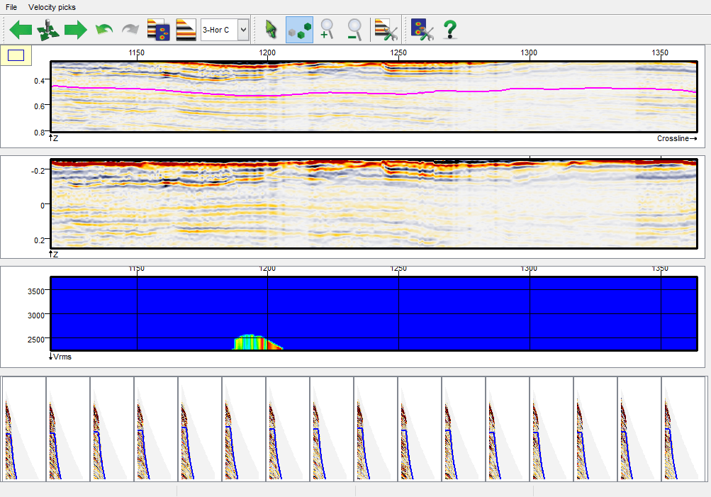 The horizon-based analysis works similarly to the vertical velocity analysis, although only Velocity picks can be picked, and neither migration velocity nor picked velocity are displayed. The mutes and prestack events must be picked in the vertical velocity analysis window. The RMO function defined by the picks will be interpolated laterally over the entire section, providing RMO corrections at each CIG of the line. A combo box allows the quick toggle between the horizons loaded in the settings. Please note that the cursor as well as the velocity picks are synchronized between both velocity analysis windows.