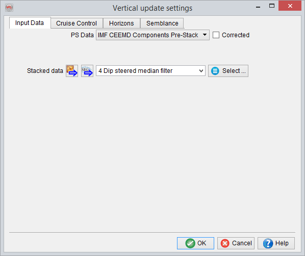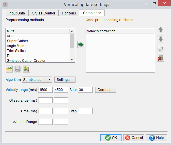 - Semblance: The semblance settings are fully similar as for the vertical velocity analysis window.