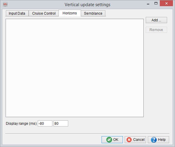- Horizons: The horizons used for the analyzes must be defined here and are loaded by pressing the add button. You can select as many horizons as you want, and specify the display range of the flattened section (second 2D viewer from the top).