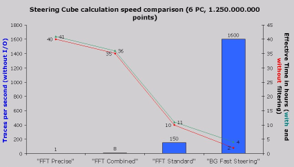 In Figure 1 the relative calculation speed is displayed for the different algorithms. The test was done on a cluster of 6 computers using distributed computing. The input cube has 817811 traces. Each trace has 1551 samples with step of 4 ms, making a total of 6200 ms. Calculation speed is measured in traces per second.