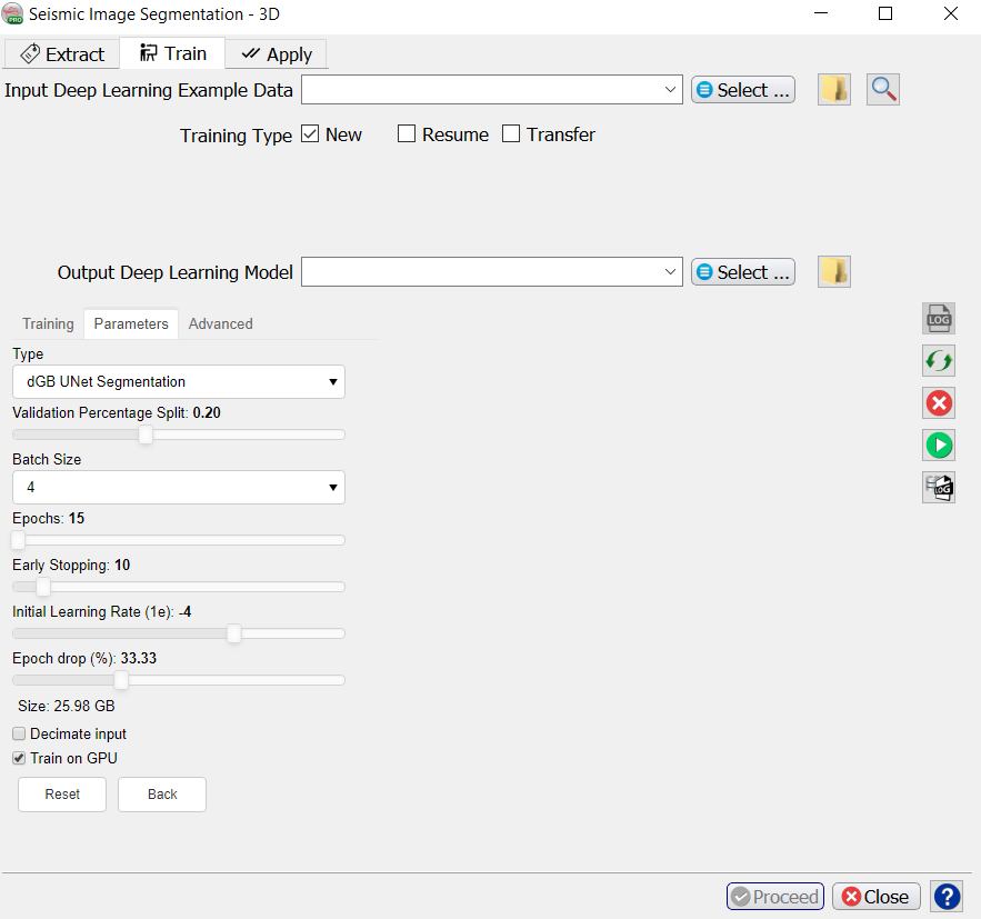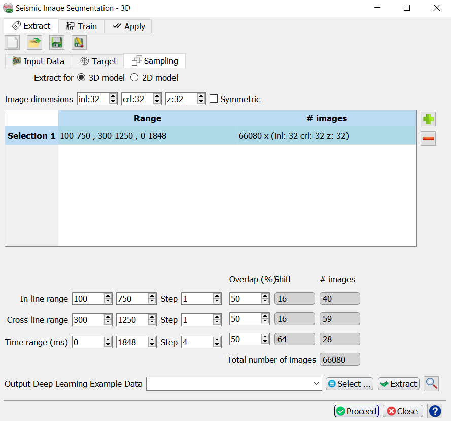 The examples (images) are extracted from the specified Inline, Crossline and Time Ranges. Step is the sampling rate in the bin (time) directions. The Overlap determines how much overlap there is between neighboring images. The total number of images is given on the right-hand side of the window. You can control this number by playing with the ranges and overlap parameters.