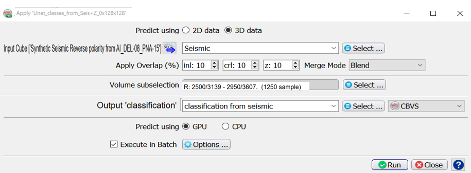 (You can run on GPU or CPU depending on the Predict using toggle). Running the application on a GPU is many times faster than running it on a CPU. Press Run to create the desired outputs. The image below is taken from a seismic facies Classification cube generated in this way.