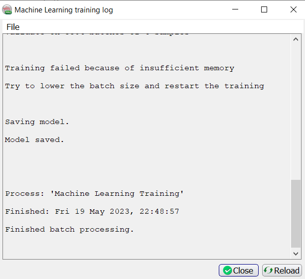 Below the log file icon there is a Reset button to reload the window. Below this there are three additional icons that control the Bokeh server, which controls the communication with the Python side of the Machine Learning plugin. The server should start automatically. In case of problems, it can be controlled manually via the Start and Stop icons. The current status of the Bokeh server can be checked by viewing the Bokeh server log file.