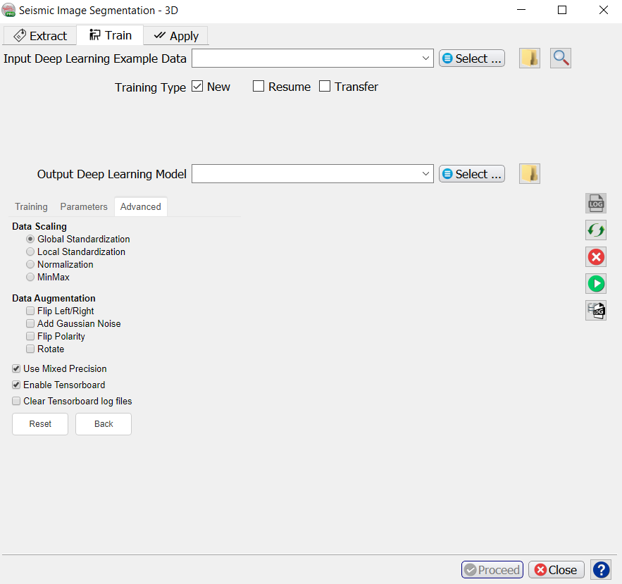 These workflows are categorized as supervised methods in that the input data set(s) and the target data are provided to facilitate training. For example, if you have a 3D seismic volume and a target 3D volume with values 1 at fault planes and 0 elsewhere, you can extract (2D images or 3D cubelets) from both volumes to create a model for fault prediction. Application of the trained model delivers a segmentation volume (3D seismic) or a line set (2D seismic). We will discuss the workflow and user interface components on the basis of a 3D example.